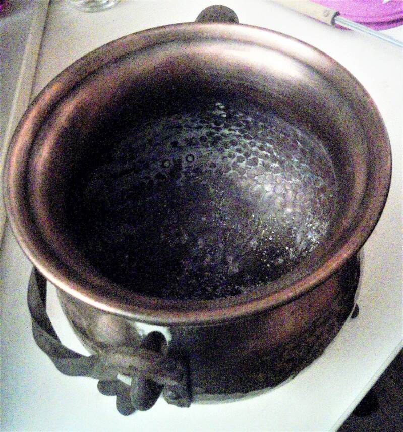 Ich habe das Glück, dass ich drei Kessel habe, beide vom Flohmarkt, also erschwinglich, einer hängt an einem Gestänge, ist emailliert und wird nur für Aufbewahrung verwendet. Er ist vom Ansehen zu schade für die Verbrennungen. Der andere Kessel ist Kupfer und steht wie der klassische Gulasch Kessel auf Füssen und dient zum Verbrennen von z. B. Papier mit Sprüchen.