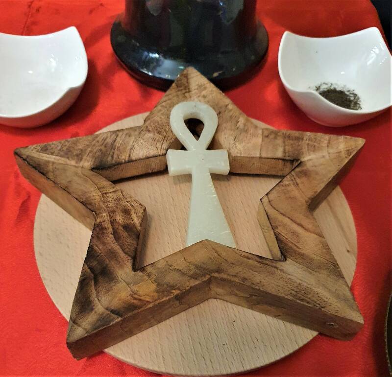 Die rituelle Scheibe (Schild) hat ein Pentagramm auf der Oberseite. Der fünf zackiger Stern, ist mit der Spitze nach oben gerichteter und in einem Kreis abgebildet.